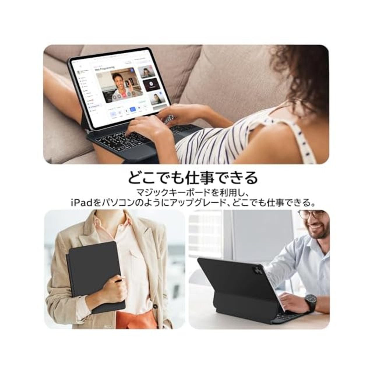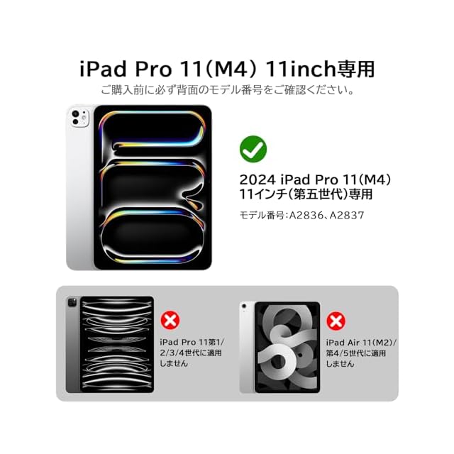 【購入前のご注意】本マジックキーボードは2024 iPad Pro 11inch(M4)第五世代に専用して設計された。適用モデル番号はA2837、A2836です。ご購入前に必ずご確認ください。iPadと接続して給電するため、お使いのiPadモデルが互換性があることを確認してください。そうでない場合は使用できません。