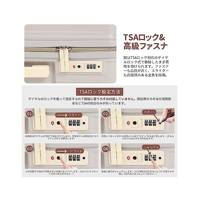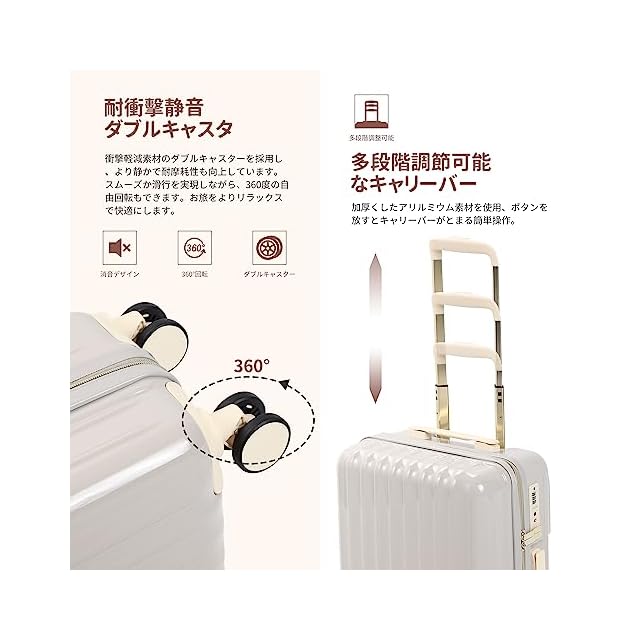 【TSAロック・360度回転静音キャスター】海外旅行には欠かせないTSAダイヤル方式のロックが搭載されており、外出がより安全になります。※鍵は航空会社検査専用のため本製品には付属しておりません。静穏、耐久性に優れた双輪キャスター、スムーズな滑りを実現しながら、360度の自由回転もできます。