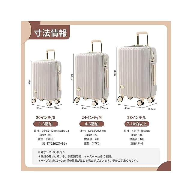 【機内持ち込みサイズ】:57×36×22三辺合計115cm。サイズは外寸(高さはキャスターを含む地面からの高さです。)機内持ち込み可能 キャリーケース。容量:40L、宿泊目安:1~3泊。シンプルで大きいスーツケースが欲しい人向け。