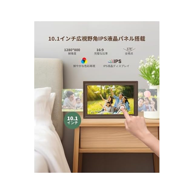 【10.1インチ高精細タッチパネル】FANGORデジタルフレームは、1280*800フルHD解像度のビデオ再生と16:9アスペクト比の優れた品質の画像を提供します。スマホより簡潔なシステムを搭載、手軽に触れて操作可能。画面の左側を指で上下にスワイプして、画面の明るさを調整します。 右側を上下にスワイプしてビデオの音量を調整します。初心者にも直感的でわかりやすい操作が可能です。フォントサイズを変更できるので、高齢者の目に優しい。