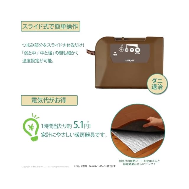 【簡単操作】コントローラーはつまみを動かすだけで、簡単に操作できるシンプルな設計です。温度設定は『弱・中・強』の三段階です。さらに、弱から中の間、中から強の間と細かい温度設定も可能です。お好みの温度に設定してお使いいただけます。