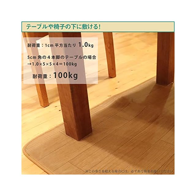 【テーブルやいすの下に敷ける】テーブルやいすの下に敷いて使うことができます。1平方センチメートルあたり1.0kgまで耐えることができます。この重さを超える場合には、あて板をお使いください。