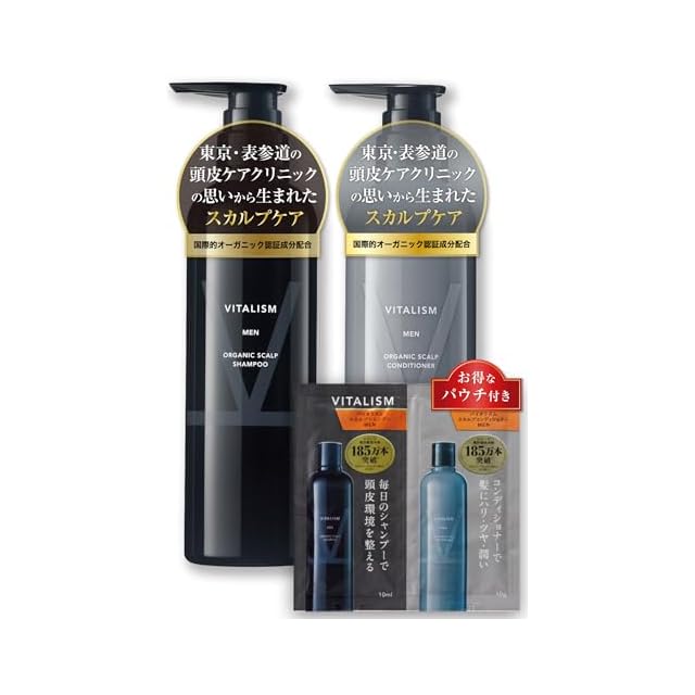 バイタリズム(VITALISM) スカルプケア シャンプー & コンディショナー セット 各500ml メンズ 【頭皮ケア クリニック の思いから生まれた スカルプ ケア】 [国際的 オーガニック 認証成分配合] (男性用) 大容量 ポンプ式 / 【 メーカー限定 旅行用 パウチ 付き 】