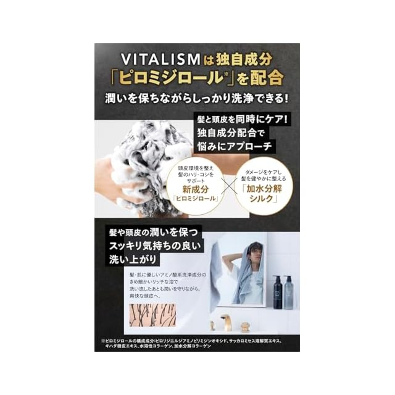 ✅▼ シャンプー:ヘアケアとスカルプケアを両立させる成分として独自に研究・開発した新成分「ピロミジロール」を配合 ▼ サロン系の高品質洗浄成分であるコラーゲン由来の「P.T.T系洗浄成分(ココイル加水分解コラーゲン)」を使用。【リッチな泡立ちと上質の使用感を実現】