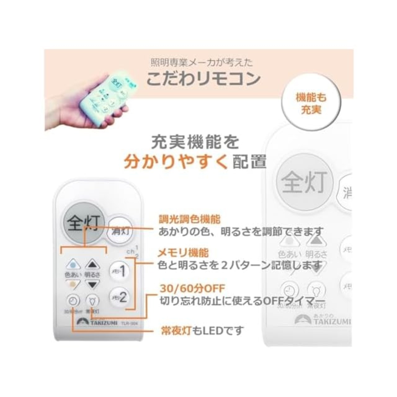 【くらしに必要十分な機能】 あかりの色、明るさ調整機能・常夜灯・お好みの明るさを記憶するメモリ機能・消し忘れ防止のOFFタイマー機能つき
