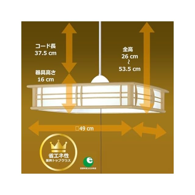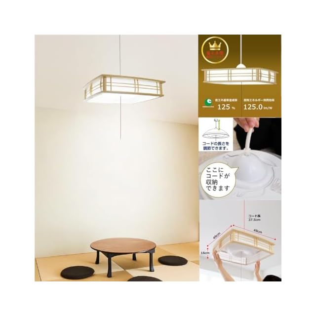 【製品の仕様】 商品サイズ:幅 □49.0㎝ 高 16.0cm 質量 2.4kg コード長 37.5cm 全高 53.5cm(器具含む高さ約26.0cm~約53.5cmで調節可能) 適用畳数:~12畳用(定格光束:4700lm/W) 消費電力:33.2W (消費効率:141.5lm/W)/年間電気代:約1800円 色合い:昼光色(6500K)/演色性:Ra83 引きひもスイッチ付き:全灯⇒約50%調光⇒LED常夜灯⇒消灯/リモコン付き:100%~約10%で調光可能