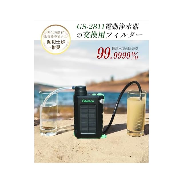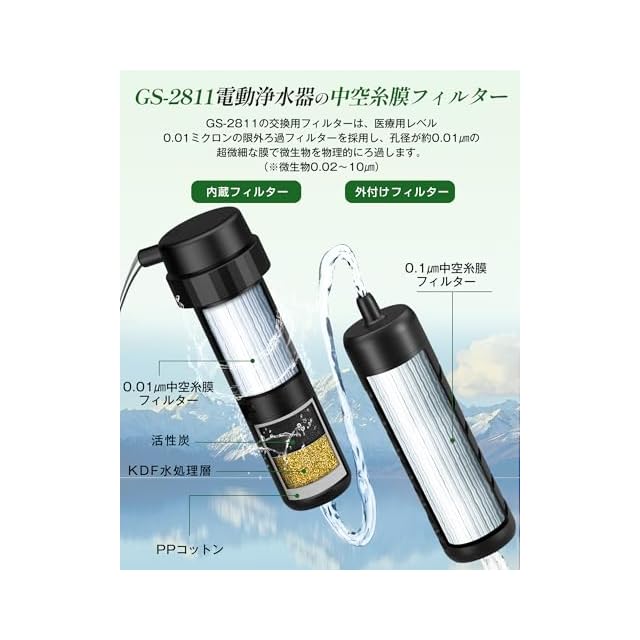 商品名:Greeshow GS-2811 電動浄水器 交換用フィルター 限外ろ過 防災 携帯浄水器 アウトドア 濾過器 中空糸膜カートリッジ ブラック 内蔵フィルター1個と外付けフィルター1個【日本正規品】
