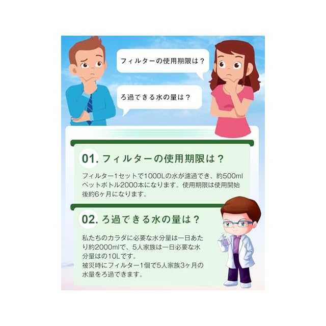 交換簡単&長寿命:使用済みのフィルターを取り外し、新しいフィルターと交換するだけです。連続ろ過水量1000リットル!より安心でより安全に使用することができます。使用期限:使用開始後、約6ヶ月。(あるいは浄水器の総使用容量が上限に達している場合)注:水に含まれる電解物質(カルシウム、マグネシウム)などの有益成分は除去しません。