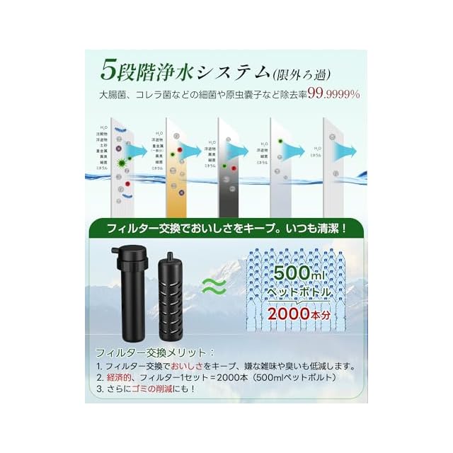 効果的な限外ろ過性能:Greeshow GS-2811携帯浄水器の中空糸膜フィルターは厚生労働省の水質基準に照らし合わせて、水質検査を実施しております。プロも信頼するほどの安全品質であることを水質検査成績書にて証明されております。驚異の除去率99.9999%を国内の水質検査機関にて実証した携帯浄水器です。水道水や川、渓流の水、雨水の浄化なども可能です。安心して飲めるほど透き通った清潔な飲料水にろ過することができます。実はミネラルを豊富に含む水道水。そのミネラルは保ったまま、雑菌まで除去できるのはGreeshowだけです。