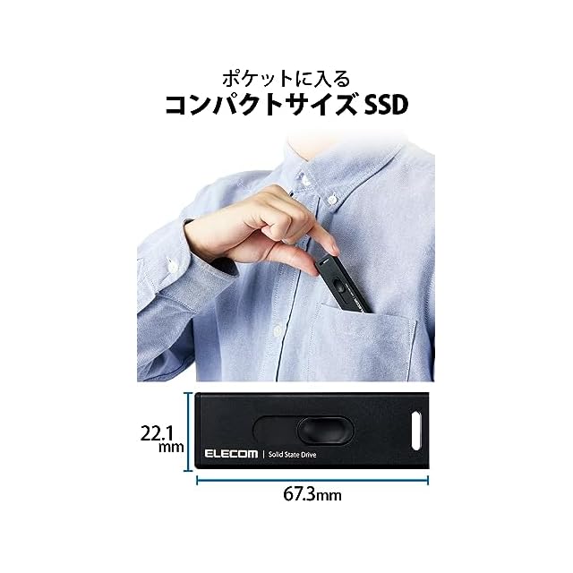 <b>【 仕様 】</b><br>■対応OS(Windows):Windows 11/10<br>■対応OS(mac):macOS Ventura 13/macOS Monterey 12/macOS Big Sur 11<br>■対応ゲーム機:PlayStation(R) 4、PlayStation(R) 4 Pro、PlayStation(R) 5 ※PlayStation(R) 5のソフトデータは拡張ストレージから起動できません。<br>■対応機種:SHARP/AQUOS、SONY/BRAVIA、REGZA、Panasonic/VIERA・DIGA、Hisense、LG Electronicsなどのテレビ・レコーダー<br>■インターフェイス:USB 10Gbps(USB3.2(Gen2))<br>■コネクタ形状:USB-A<br>■容量:2TB<br>■データ転送速度:読み込み:最大500MB/s、書き込み:最大480MB/s ※USB 10Gbps(USB3.2(Gen2))でご使用になるには、機器側がUSB 10Gbps(USB3.2(Gen2))に対応している必要があります。<br>■出荷時フォーマット:NTFS<br>■セキュリティソフトウェア対応機種:Windows 11/10が動作するWindowsパソコン、およびmacOS Ventura 13/macOS Monterey 12/macOS Big Sur 11が動作するMac<br>■外形寸法:幅約67.3mm×奥行約22.1mm×高さ約9.5mm<br>■重量:約15g<br>■電源:USBバスパワー<br>■カラー:ブラック<br><br><b>【 説明 】</b>■シャープ(アクオス)、ソニー(ブラビア)、レグザ、パナソニック(ビエラ・ディーガ)、ハイセンス、LGエレクトロニクスなどのデジタルテレビに接続可能です。 <br>■最新テレビ機種との対応情報は、エレコムホームページにて随時更新しているため、QRからすぐに確認ができます。 <br>■テレビやレコーダーに接続することで、番組の録画や2番組同時録画などのさらに便利な機能もご利用いただけます。 <br>■※機能の詳細、対応可否はテレビ側の仕様に依存します。 <br>■PlayStation(R) 4、PlayStation(R) 4 Pro、PlayStation(R) 5に接続し、ゲームデータを外付けSSDに保存することで、ゲームの起動時間やセーブデータのロード時間が短縮され、より快適なゲームプレイが可能です。 <br>■PlayStation(R) 5に接続し、PlayStation(R) 5のゲームデータを外付けSSDに保存することで、本体ストレージの空き容量を確保できます。 <br>■※PlayStation(R) 5で使用する場合は、PlayStation(R) 4のソフトプレイ時のみ可能となります。 <br>■※PlayStation(R) 5のソフトデータを外付けSSDから起動することはできません。 <br>■期間を「1年間」としていますので、安心してご利用いただけます。 <br>