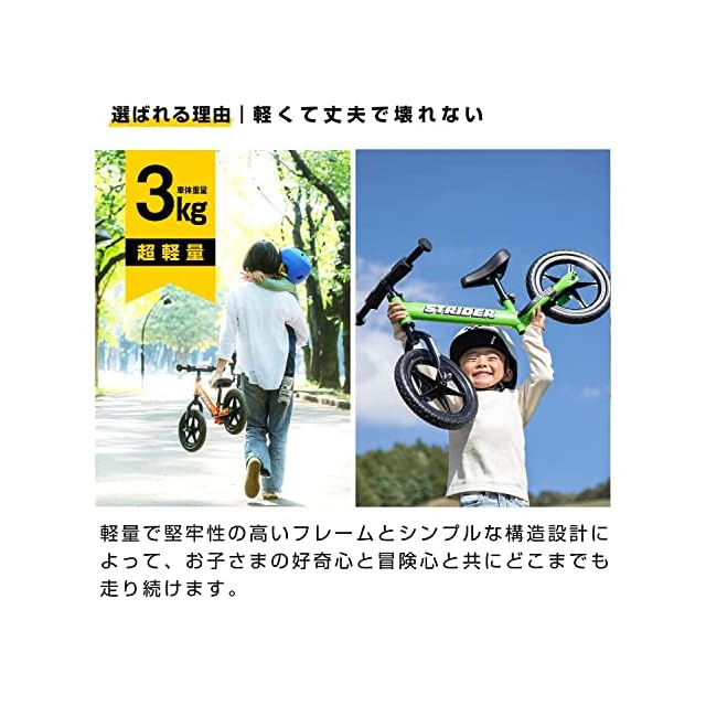 説明:クッションシート、ハンドルバーパット、フットレストが標準装備の12インチモデルのストライダーです。