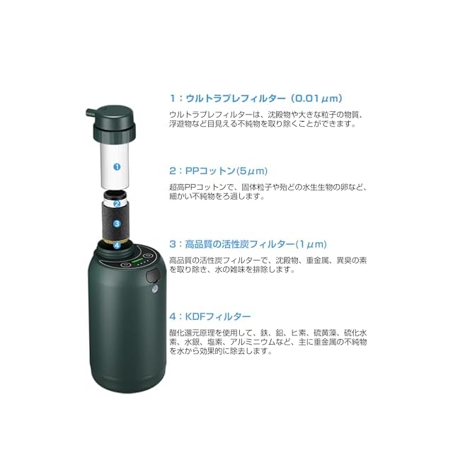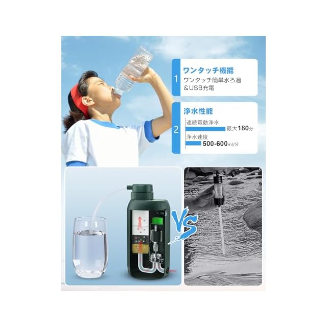 【アウトドアや防災対策】キャンプ、登山、釣りや旅行、或いは災害や断水などの緊急時に水道水、雨水、川の水やため池、泥水でも、安心して飲めるような透き通った清潔な飲料水にろ過することができます。