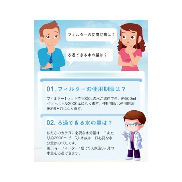 【交換簡単&長寿命】使用済みのフィルターを取り外し、新しいフィルターと交換するだけです。安心して飲めるほど透き通った清潔な飲料水にろ過することができます。フィルター1セットでろ過水量1000リットル、500mlのペットボトルは約2,000本分!社会的関心が高いプラスチックによる環境汚染。ペットボトルの水を買う機会を減らすこともプラスチックごみの削減に繋がります。