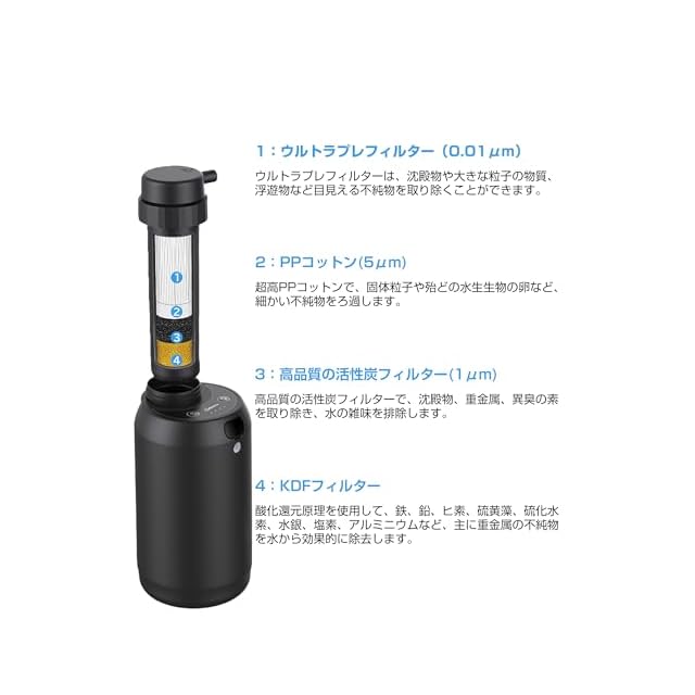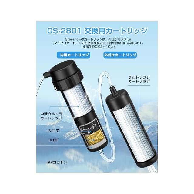 【GS-2801電動浄水器の互換性】この内蔵中空糸膜フィルターは、GS-2801電動浄水器(ブラック)に適用します。 内蔵フィルターにはKDFフィルター+高品質の活性炭フィルター+レベルPPコットンと超高品質内蔵0.01ミクロン中空糸膜フィルターを採用し、粒子、赤サビ、大腸菌、コレラ菌などの雑菌や原虫嚢子、PFAS、沈殿物などの不純物をろ過することができます。対応電動式携帯浄水器 ASIN: B0B27RM1N7、B0BNPSH25C。