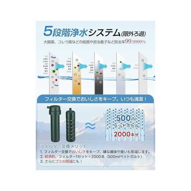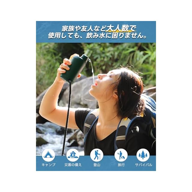 アウトドアや災害対策:家庭のキャンプ、旅行、災害や断水などの緊急時に、川の水やため池、泥水でも、安心して飲める透き通った清潔な飲料水にろ過することができます。
