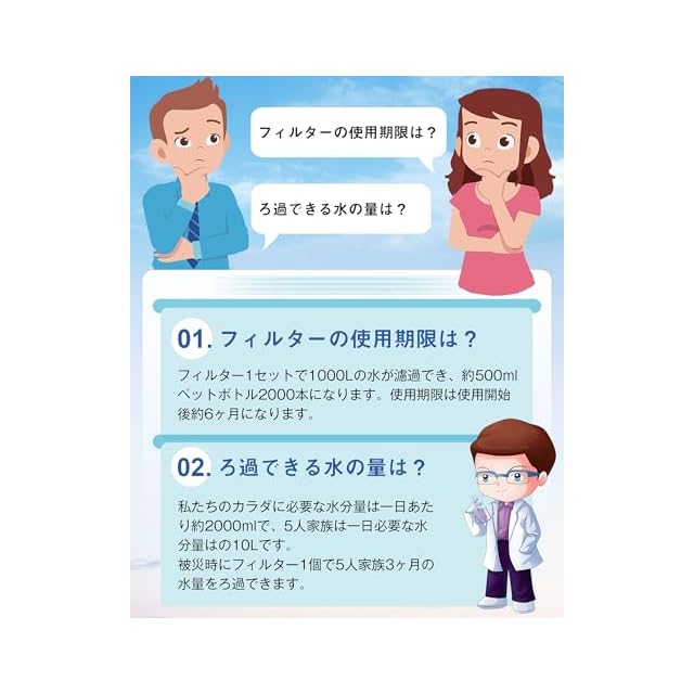 交換簡単&長寿命:使用済みのフィルターを取り外し、新しいフィルターと交換するだけです。連続ろ過水量1000リットル!より安心でより安全に使用することができます。使用期限:使用開始後、約6ヶ月。(あるいは浄水器の総使用容量が上限に達している場合)注:水に含まれる電解物質(カルシウム、マグネシウム)などの有益成分は除去しません。