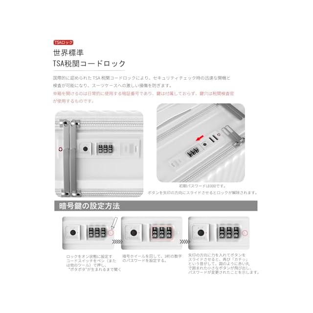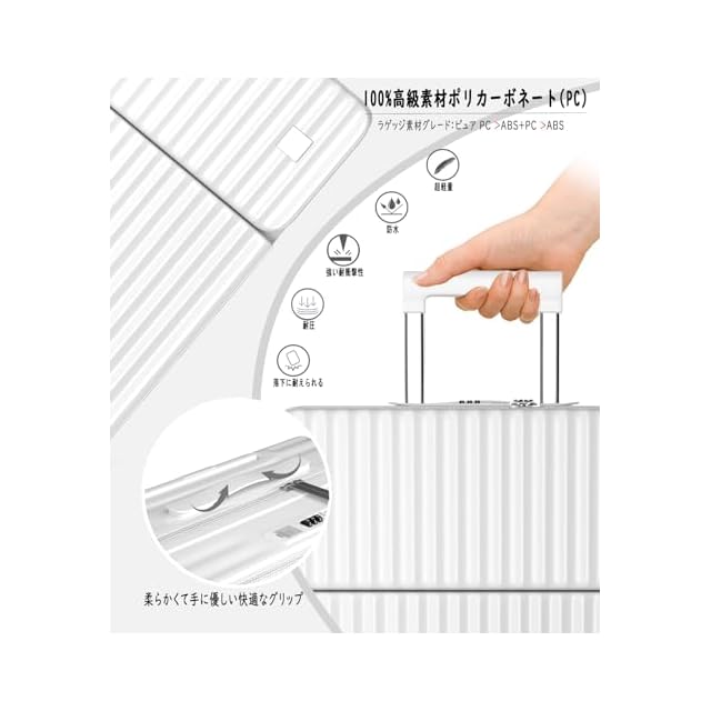 【丈夫かつ軽いPC素材&TSAダイヤル式ロック】表面素材は高耐衝撃性を持つPC(ポリカーボネート)を100%使用。高弾性で、変形しにくい。ABS素材を採用した市販品より頑丈で耐久性に優れ、ABS+PCスーツケースより軽量で持ち運びやすい。PC 素材は、現在市場で最も一般的に使用され人気のあるハードシェル ラゲッジであり、防水性、耐摩耗性、スタイリッシュさ、耐衝撃性、落下耐性を備えています。世界基準のTSAダイヤル式ロックが搭載されて、外出がより安全に。※鍵は航空会社検査専用のため本製品には付属しておりません。