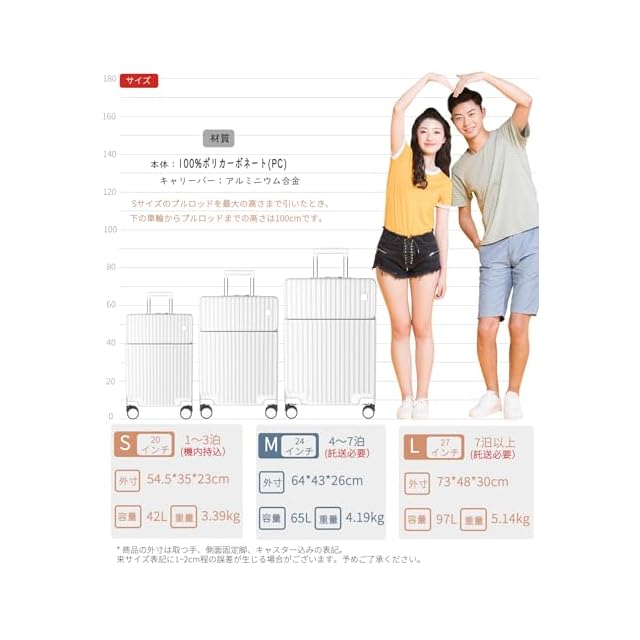 【サイズ】Sサイズの外寸は54.5*35*23cm、重さ:3.39kg 超軽容量、は42リットル、1~3泊に似合います。Sサイズは一部の航空会社だけに適用しますので、事前に航空会社に確認したほうがいいんです。Mサイズの外寸は64*43*26cm、重さ:4.19kg 、容量は65リットル、4~7泊以上。Lサイズの外寸は73*48*30cm、重さ:5.14kg、 容量は97リットル、7泊以上