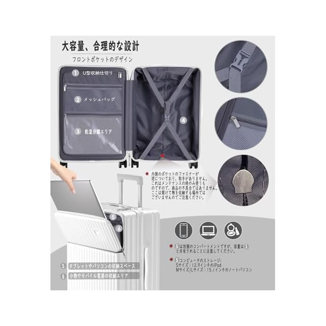 商品名:[Ashard] キャリーケース 多機能 スーツケース ストッパー付き Type C と USBポート付き フロントオープン ジッパー キャリーバッグ 携帯スタンド カップホルダー付き 隠しフック機能 超軽量 耐衝撃 静音 360度回転キャスター 100%PC材質 人気 頑丈 可愛い TSAロック搭載 旅行 ビジネス 出張 修学 (Mサイズ/4~7泊/65L/託送必要, ホワイト)