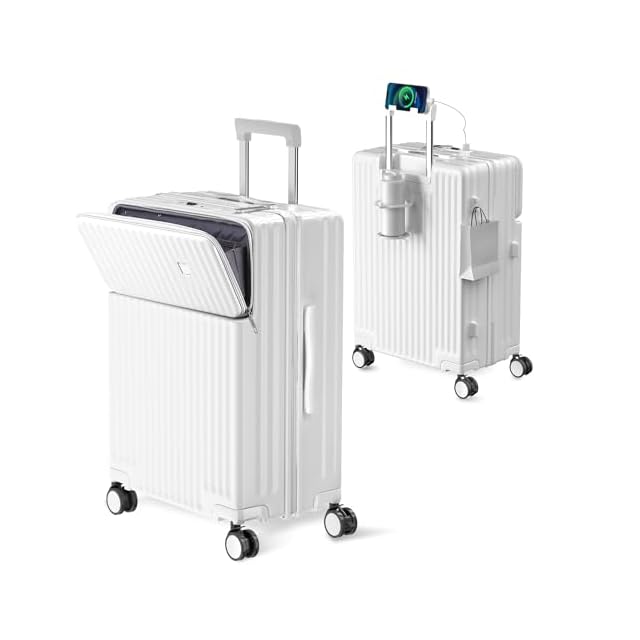 [Ashard] キャリーケース 多機能 スーツケース ストッパー付き Type C と USBポート付き フロントオープン ジッパー キャリーバッグ 携帯スタンド カップホルダー付き 隠しフック機能 超軽量 耐衝撃 静音 360度回転キャスター 100%PC材質 人気 頑丈 可愛い TSAロック搭載 旅行 ビジネス 出張 修学 (Mサイズ/4~7泊/65L/託送必要, ホワイト)