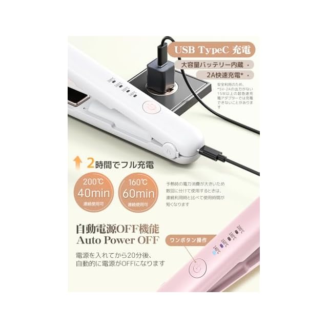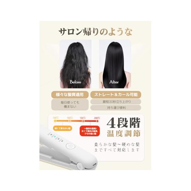 【飛行機持ち込み不可!!】【2024年コードレスデザイン】【ご注意:充電器コンセントなしです!!!】【66W以内の充電器コンセントをお勧めします。】コンパクトかつコードレスなモデルでバッグに入れて持ち運べるので、出張や旅行の際にスタイリングを楽しめます。前髪や毛先カールの手直しにもおすすめです。コードの束縛や絡まりの心配がなく、使いやすいです。また、電池交換の手間が不要で持ち運び便利。