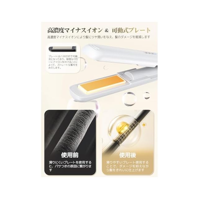【2WAY カール&ストレート】髪をまっすぐに整えられるのはもちろん、カールにしてボリューム感を出したりヘアアレンジを自由に楽しんだりもできます。セラミック加工のプレートで、髪の水分を適度に保ち、枝毛や切れ毛を軽減。