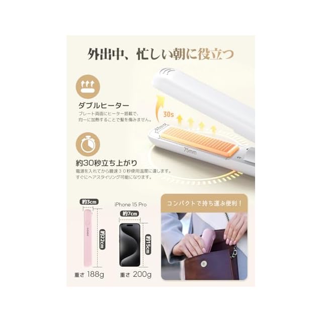 【最速の立ち上げ時間 】ダブルPTCヒーターを搭載し、時間がない時でも約30秒で急速加熱で、使用開始可能となる。使いたいときにサッと使えるので便利。朝の忙しい時間に使う機会が多い方や、できるだけ短時間でクセを直したい方はこのコードレスヘアアイロンチェックしてみてください。