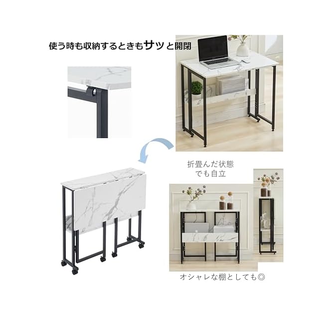 【優れた収納性】デスク下には延長コードや、タブレット、本などを置くことができる収納棚付き。身の回りのものを収納して見た目をスッキリさせることができます。天板したのボタンを押すだけで、簡単に折り畳みできるのでインテリアを置く物置や、ドレッサー、キッチンでのサイドテーブルとしても活用可能