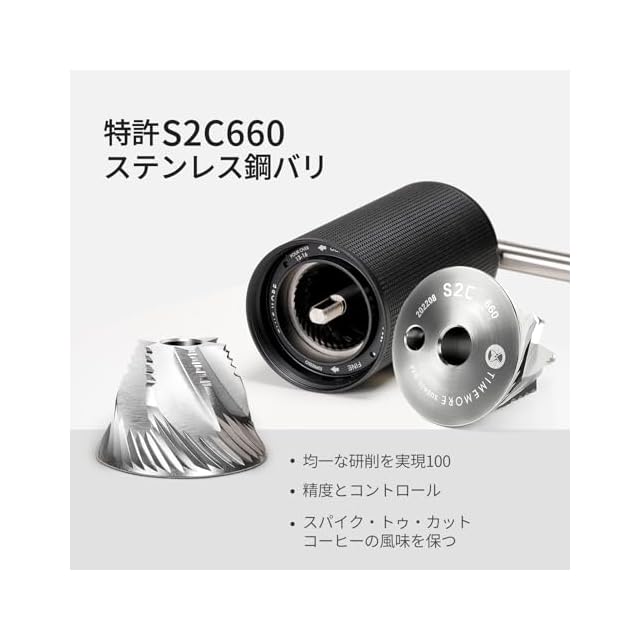 【特許取得済みのS2C臼刃】C3S Proコーヒーミルは、Chestnut Xから採用されたTimemore特許取得済みのS2C 660ステンレス製バールを38mmの小さなサイズで搭載しており、6軸の高精度CNC切断プロセスにより、均一な粉をし、コーヒー豆は一貫性と迅速な研削によって最高の味を確保します。
