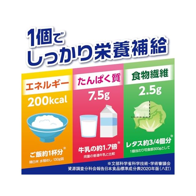 たんぱく質7.5g(牛乳の約1.7倍)、食物繊維2.5g(バナナ約2本分)の他、11種類のビタミン、10種類ミネラルなど体に大切な栄養素を1本で効率的に補給できます。
