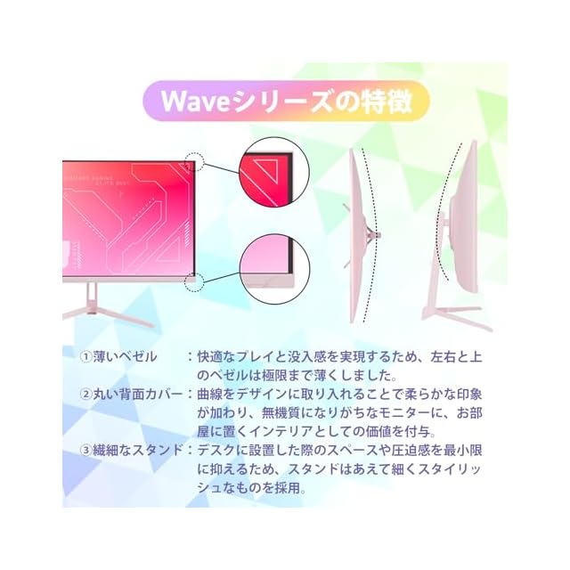 【理想のゲーム部屋に】デスク周りを好きなカラーでコーディネートができるゲーミングモニター。スタイリッシュでおしゃれな本体は、お部屋のインテリアを損ねることなく馴染みます。同じカラーのモニターアームもシングル(PS1S Wave)とデュアル(PS1D Wave)をそろえていて、より統一感を持たせられます。ホワイトの他ブルーやピンクなど7色展開で他にはない色味をお楽しみください。