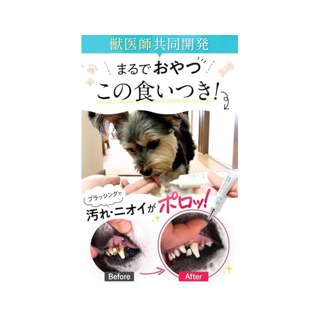 【使用方法】 ・1回使用量目安:付属スプーンすり切り約1杯 食後などに適量を清潔な指やガーゼにとり、口腔内にまんべんなく塗布してください。 ・口の周りについた余分なジェルはおふきとり下さい。 また、 ・直接なめさせる ・おもちゃに塗る ・フードに混ぜる ・犬用歯ブラシ、 犬 歯磨き 犬 歯石取り と一緒に使う といった方法でもご使用いただけます。