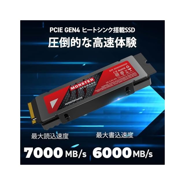 商品名:Monster Storage SSD 1TB NVMe PCIe Gen4×4 PS5確認済み 最大読込: 7,000MB/s 最大書き:6,000MB/s ヒートシンク付き M.2 Type 2280 内蔵 SSD 3D NAND 国内正規品 メーカー5年
