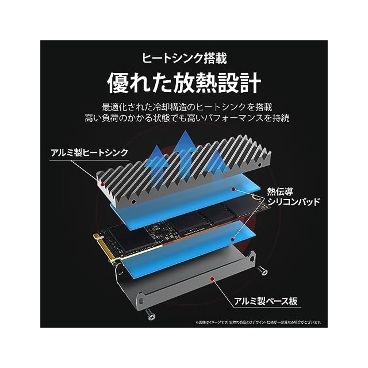 ※PS5に取り付ける際は、必ずPS5付属のスペーサーを「80」と記された穴に装着し、その後ネジを締めてください。スペーサーを装着しない場合や、ネジを過度に締めすぎると、M.2 SSDが破損する恐れがあります。 ※PS5やPCなどのM.2スロットにSSDを取り付ける際には、ヒートシンクを押し込むことでヒートシンクがずれる可能性があるため、SSDの後部基板を持ちながらM.2スロットに押し込んでください。 ※本製品には、マザーボードにM.2 SSDを固定するためのネジは付属していませんのでご注意ください。