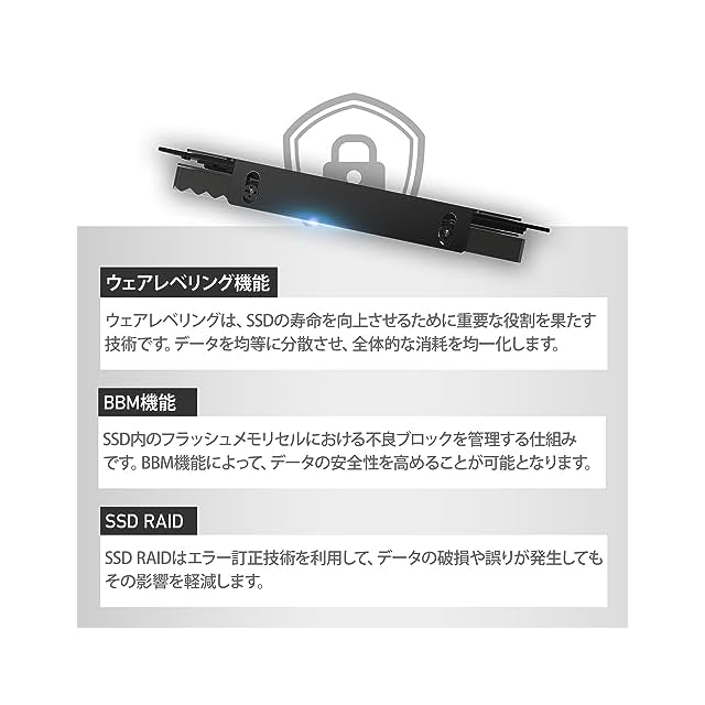 製品のについて<br> 1. 安心の国内<br> 安心の長期5年に対応。 ※ただし、製品仕様に記載している書き込み可能容量(TBW)に達した場合、5年以内でも期間は終了となります。期間中に正常な使用状態で故障した場合、無償で交換を行います。が必要な際はご購入履歴をご提示ください。データについては対象外です。<br> <br> 2. 適用外事項<br> <br> 期間中においても下記の場合は、有償修理となります。<br> 1.書の提示がない場合。<br> 2.販売証明のご提示がない場合。<br> 3.偶発事項、火災、地震、水害、落雷、その他の人災、天災、公害、塩害などの損傷、故障の場合。<br> 4.お買い上げ後の輸送、落下、移動による物理損傷、製品耐久性を超えた場合。<br> 5.本製品を取り付ける機器類の使用範囲を超える使用により生じた故障及び損傷。取り扱い上の誤り及び不当の修理や改造。<br> <br>