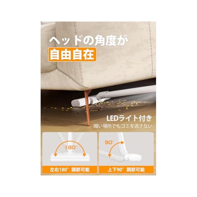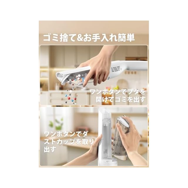 【軽量➕多目的ノズル付き】そうじきは超軽量、加えてヘッドに自走機能が搭載されていることもあり、軽い力でグングン進む自走式デザイン、細かいほこりや砂ゴミをパワフルに吸引。より軽い力で掃除可能。ライト付き、ほこりが見やすく、暗い場所のゴミも逃さない。ハンディ掃除機は片手で持ち運びができます。人間工学に基づくハンドルデザインと手元に置いた重心により、女性でも持ち上げやすく、エアコンや網戸など高い場所にも簡単に届きます。3種類のノズルが付属しており、布団やソファーなどのファブリックはもちろん、車内など、さまざまなシーンで使えます。細かい隙間にまでしっかり掃除することができ、心地よい掃除が実現します。