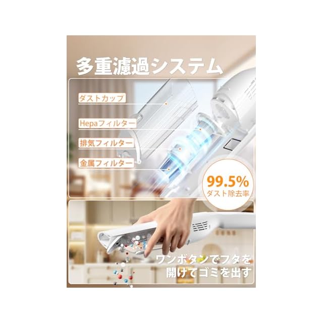 【25000pa強力吸引➕多層濾過➕お手入れ簡単】掃除機は120W最上クラスのブラシレスモーターを採用して、最大25000Paの吸引力をサポートし、フローリングの溝の吸引力は従来の5倍と、デスクの埃やゴミはもちろん、カーペットに入り込んだ砂や土などもしっかり吸い取れます。片手で使えて、全部屋は1台で掃除できます。また、フィルターやヘッドブラシは水洗いが可能なので、コードレスクリーナーを清潔に使えます。HEPAフィルターが2つ入ってるので、洗って乾くまで待たなくてもすぐにご利用できます。標準モード:吸引力約20000Pa 強力モード:吸引力約25000Pa
