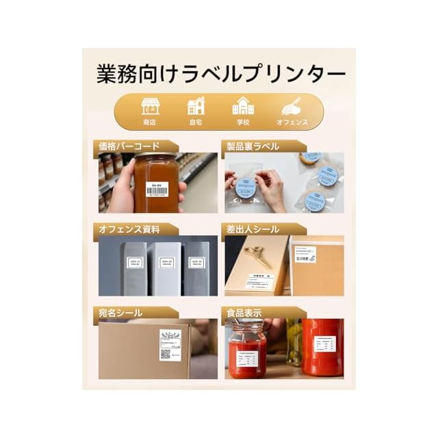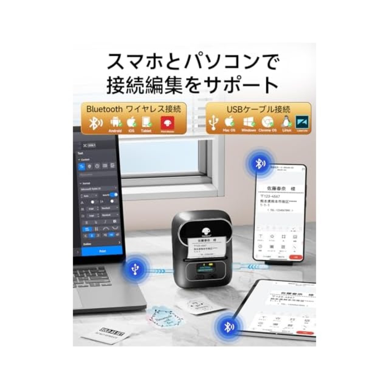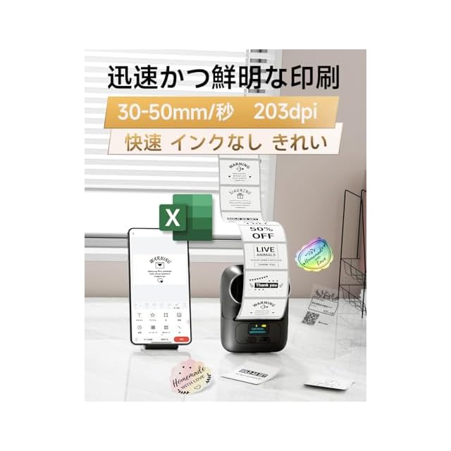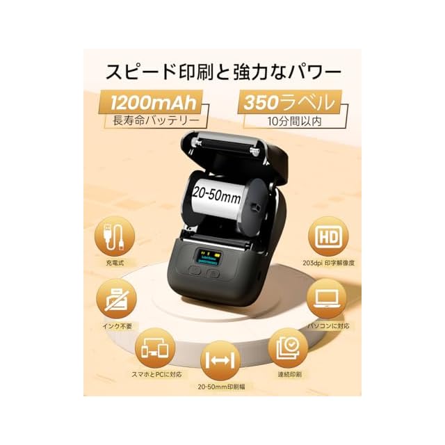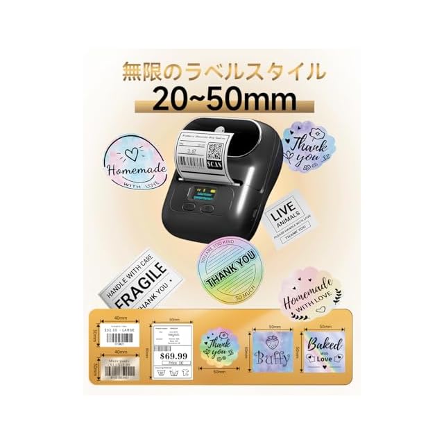 幅20-50 mmラベルシールに対応:このラベルプリンターは、幅20-50 mmのダイカット形専用ラベルシールに対応いたします。そのラベルシールの表面に保護コーティングが施されており、耐水性、耐油性、 耐久性があります。アプリでセットしたラベルサイズを選択し、印刷したいテキスト、アイコン、バーコードなどを自由に入力するだけで、アプリでの効果をプレビューできます。初めての方でも手軽にラベルシールが作れるのが魅力です