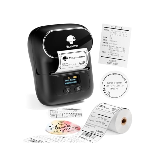 Phomemoのラベルプリンター「M110」は、スマホやタブレット、PCから接続して印刷できる多機能サーマルプリンターです。郵便宛名、値札、食品表示、梱包、アドレス、ラッピング、DIYラベル、作業、冷蔵庫収納、FBAラベル、配送ラベル、整理収納、名前ラベル、葉書等を印刷できます。生活と仕事に役に立ちます