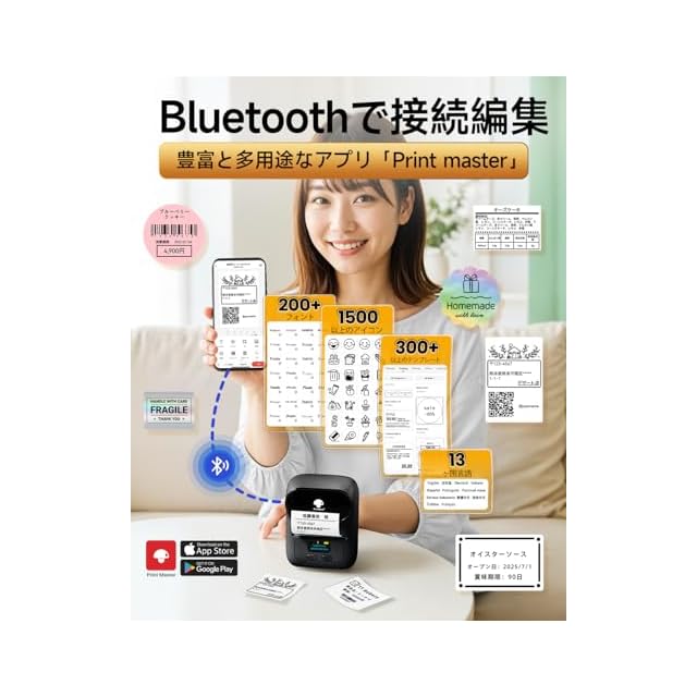 フリーな多機能アプリ:App storeやGoogle Playで「Print Master」を検索して、専用アプリをダウンロードしてください。「Print Master」アプリにはすでに20種類フレーム、36種類フォント、100種類なテンプレート、500以上種類なアイコンが用意されており、また定期的に新しい素材のをリリースする予定です。テキスト、QRコード、バーコード、アイコン、表、画像、線、時間、Excelインポートの機能で自由に作りましょう