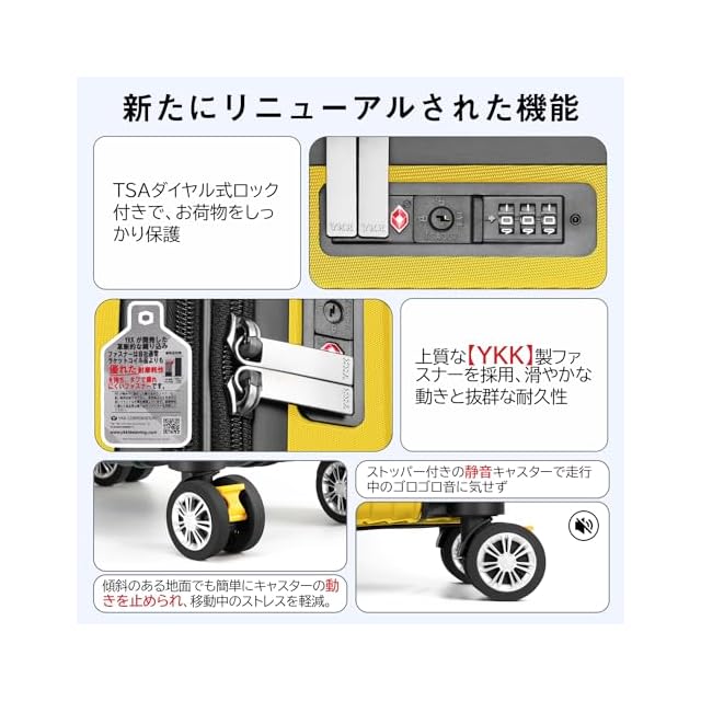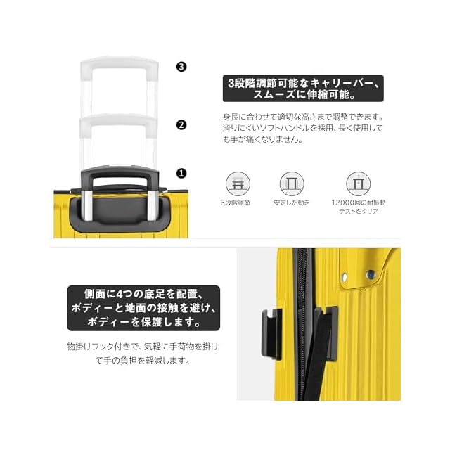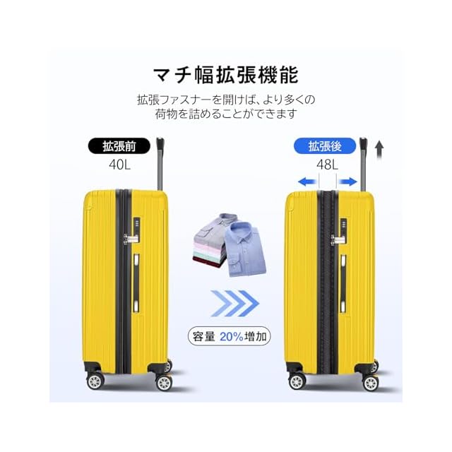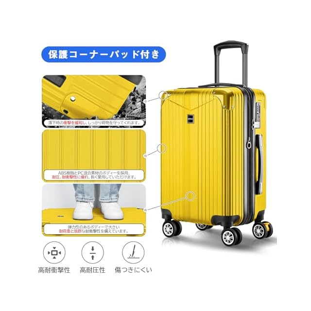 商品名:[VARNIC] スーツケース キャリーケース キャリーバッグ 【YKK】 製ファスナー 拡張機能 ストッパー付きキャスター TSAダイヤル式ロック 振動軽減 軽量 大容量 静音 乾湿分離ポケットつき スーツケースベルト付き 物掛けフック式底足 ファスナータイプ 旅行 ビジネス 出張 学生用キャリーケース (イエロー, S)