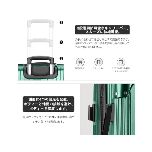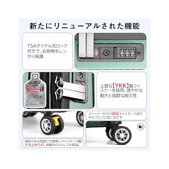 商品名:[VARNIC] スーツケース キャリーケース キャリーバッグ 【YKK】 製ファスナー 拡張機能 ストッパー付きキャスター TSAダイヤル式ロック 振動軽減 軽量 大容量 静音 乾湿分離ポケットつき スーツケースベルト付き 物掛けフック式底足 ファスナータイプ 旅行 ビジネス 出張 学生用キャリーケース (グリーン, S)