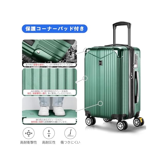 スーツケースの拡張機能を利用すれば、マチ幅が5cmほど拡張し、約20%内容量を増加。ABS樹脂とPC混合素材のボディーはただのABS素材より軽量で耐圧性、耐久性に優れています。コーナーパッド付きで、耐衝撃性も抜群です。