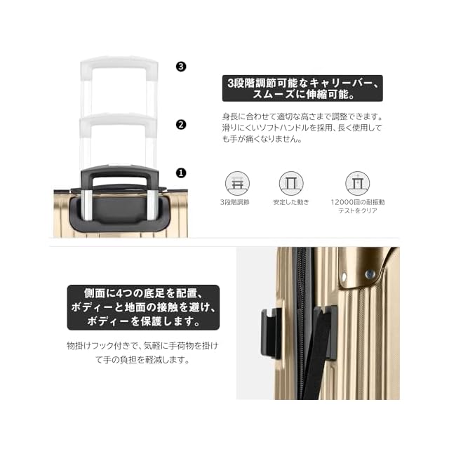 商品名:[VARNIC] スーツケース キャリーケース キャリーバッグ 【YKK】 製ファスナー 拡張機能 ストッパー付きキャスター TSAダイヤル式ロック 振動軽減 軽量 大容量 静音 乾湿分離ポケットつき スーツケースベルト付き 物掛けフック式底足 ファスナータイプ 旅行 ビジネス 出張 学生用キャリーケース (シャンパンゴールド, M)