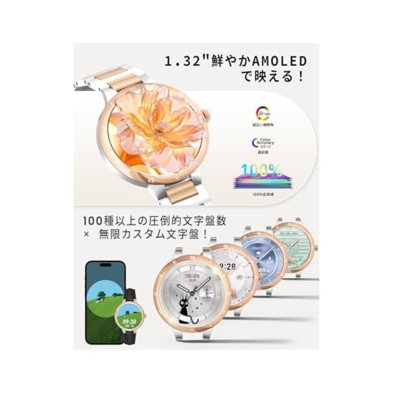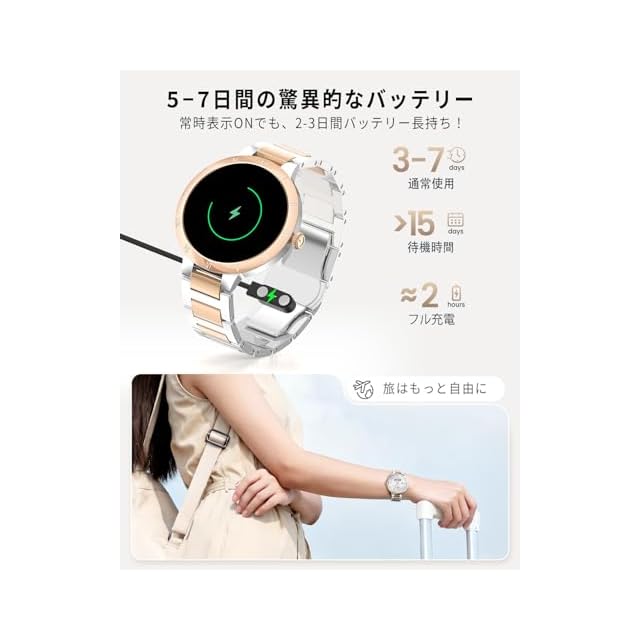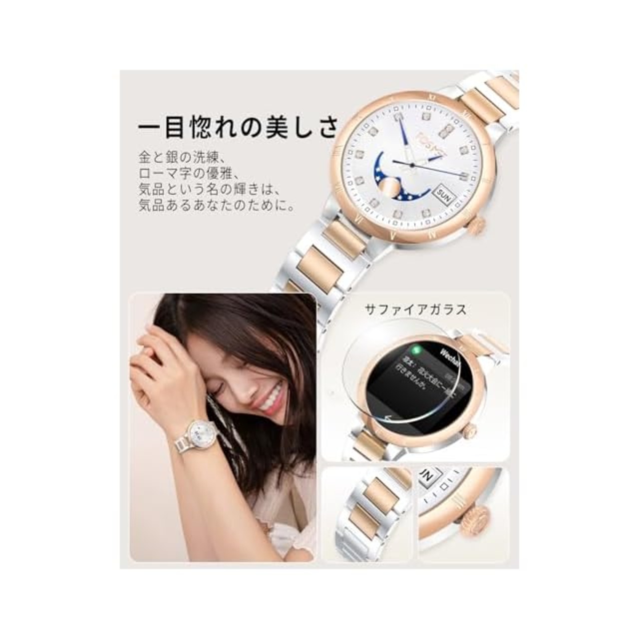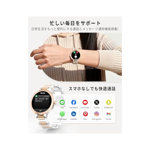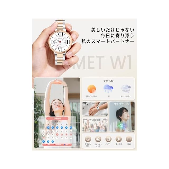 【サファイアガラス・AMOLED搭載&光沢カラーが特徴】FOSMET W1 スマートウォッチ レディースは、ゴールドとシルバーの高級感溢れるカラーに、ローマ数字が刻まれたベゼルが上品さを引き立て、女性の手首にフィットする1.32インチのサファイアディスプレイを採用により、よりエレガントでシンプルな小さめのスマートウォッチを実現しています。鮮やかなAMOLED画面は視認性に優れ、サファイアガラスは非常に滑らかで、心地よくスライド操作が可能。ベルトは2種類から簡単に交換できるので、初めてのレディース腕時計や日常使いにも最適です。シンプルで飽きのこない丸型デザインは、オフィスからカジュアルまで幅広いシーンで活躍します。