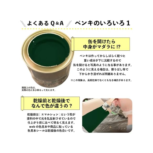 【塗装時の注意・救急処置】※取扱いの際は、商品記載の注意事項等をよく読んでからご使用ください。 ■[乾燥時間・塗面積について]乾燥時間、塗面積の表示は、気象条件・塗る素材・形状・塗り方などによって多少異なります。 ■[塗装時は広がり易いので要注意]人・物・観賞魚・ペット類・食品等にかからないようにして下さい。 ■[寒期・梅雨時期は注意を]気温5℃以下の時や、雨天・湿度の高い時(169%以上)及び風の強い時は、塗らないで下さい。 ■[汚れてもいい服装で]汚れても差し支えのない服装で作業してください。