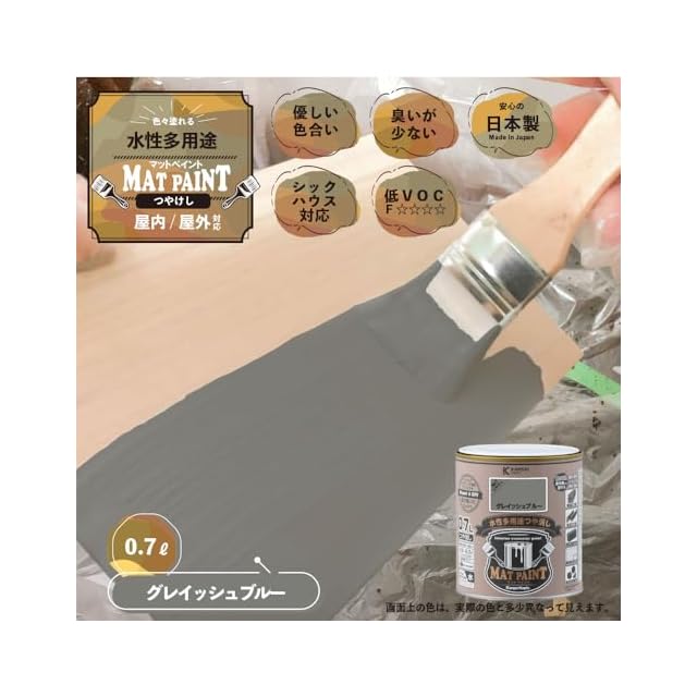 【特長】■[落ち着いたツヤ消し仕上がり]優しい色合いのつや消しタイプ。 落ち着いたツヤがガーデニングの花や植栽、他のインテリアの色調にマッチします。 ■[屋外・屋内 幅広く使用できます]屋内外の木部・鉄部・コンクリート・プラスチックから、かべ紙まで幅広い用途に使用できます。 ■[防カビ剤配合]長期間カビの発生を防ぎます。 ■[塗りやすい塗料]臭いが少なく、乾燥が速く、塗りやすい水性塗料です。