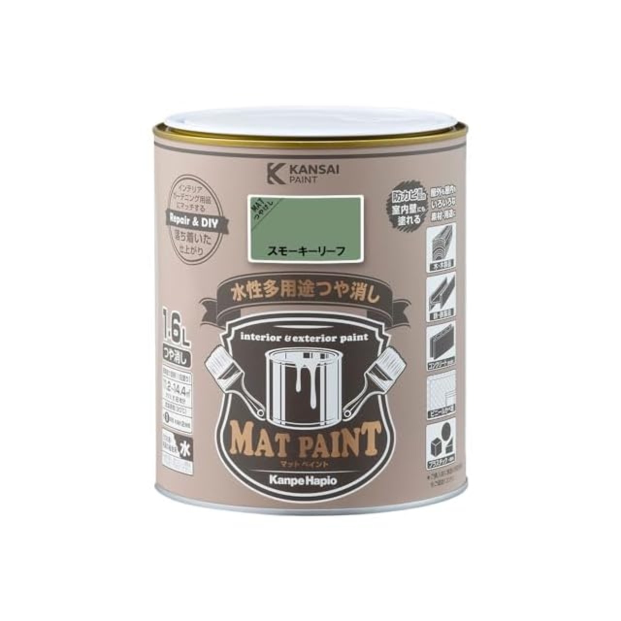 商品名:カンペハピオ ペンキ 塗料 水性 つやけし 多用途 マットペイント スモーキーリーフ 1.6L 日本製 00347652461016
