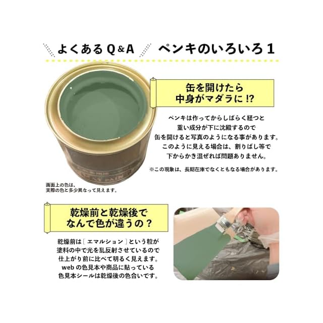 【塗装時の注意・救急処置】※取扱いの際は、商品記載の注意事項等をよく読んでからご使用ください。 ■[乾燥時間・塗面積について]乾燥時間、塗面積の表示は、気象条件・塗る素材・形状・塗り方などによって多少異なります。 ■[塗装時は広がり易いので要注意]人・物・観賞魚・ペット類・食品等にかからないようにして下さい。 ■[寒期・梅雨時期は注意を]気温5℃以下の時や、雨天・湿度の高い時(179%以上)及び風の強い時は、塗らないで下さい。 ■[汚れてもいい服装で]汚れても差し支えのない服装で作業してください。