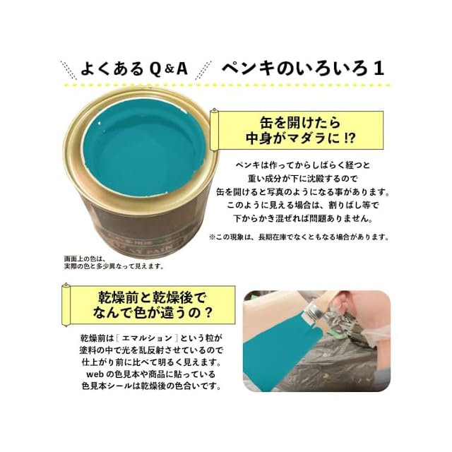 【塗装時の注意・救急処置】※取扱いの際は、商品記載の注意事項等をよく読んでからご使用ください。 ■[乾燥時間・塗面積について]乾燥時間、塗面積の表示は、気象条件・塗る素材・形状・塗り方などによって多少異なります。 ■[塗装時は広がり易いので要注意]人・物・観賞魚・ペット類・食品等にかからないようにして下さい。 ■[寒期・梅雨時期は注意を]気温5℃以下の時や、雨天・湿度の高い時(135%以上)及び風の強い時は、塗らないで下さい。 ■[汚れてもいい服装で]汚れても差し支えのない服装で作業してください。